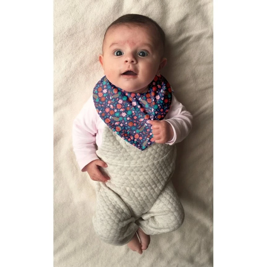 It accompanies babies throughout the day by protecting their clothes from drooling. The bandana bib, practical and adorable, will match all your baby’s outfits and will protect him outside of mealtime. With this original bib, say goodbye to wet clothes when he plays in his playpen or stroller.